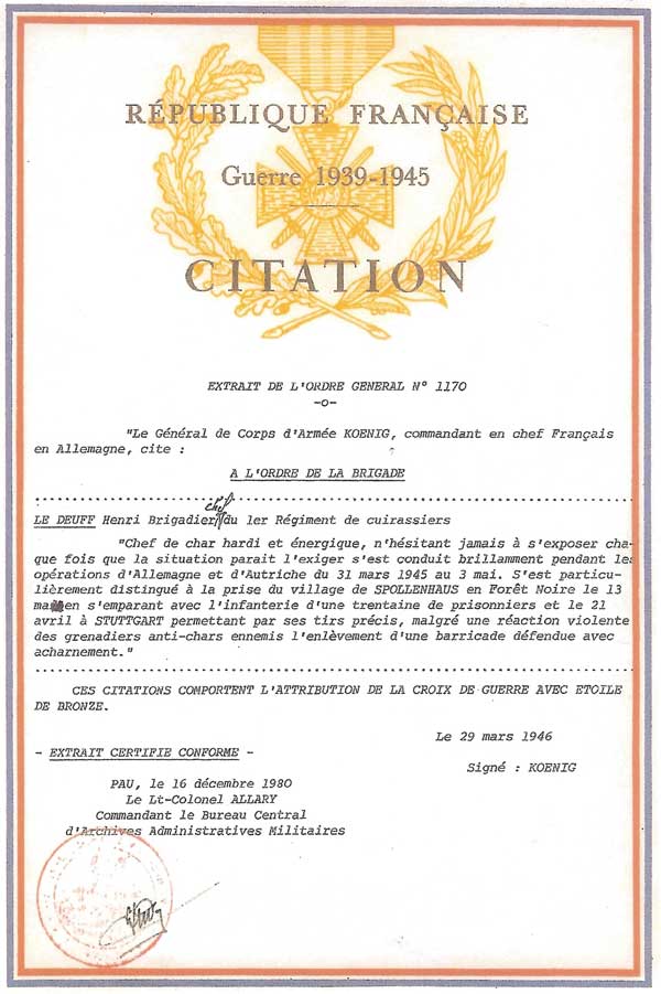 Après la campagne de Tunisie, lorsque le Général de Lattre de Tassigny a passé en revue les troupes de l’école des cadres d’Alger où l’on m’avait envoyé, il m’a posé la question : « tu as déjà 2 croix de guerre, où les as-tu eues ? ». J’ai répondu : « la première contre les Américains, la deuxième contre les Allemands ». « C’est bien ! » m’a-t-il répondu.