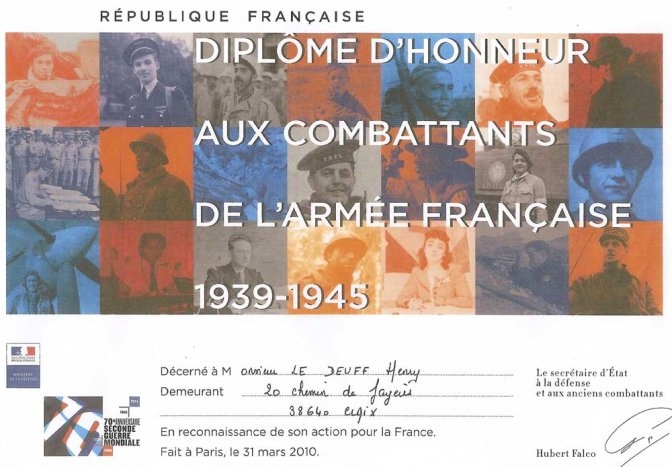Ce jeudi 11 novembre 2010, après la commémoration de l’Armistice, il a reçu, avec d’autres récipiendaires, le diplôme d’honneur des Combattants de l’Armée Française.