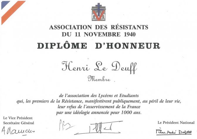 L’histoire vécue par Henry Le Deuff : "les allemands avaient donné l’ordre vis à vis de la faculté d’interdire toute manifestation de la commémoration de la guerre de 14 – 18. La rumeur, chez les lycéens, disait, envers et contre tous : nous ne sommes pas comme nos parents et nous refusons d’obéir à l’occupant.