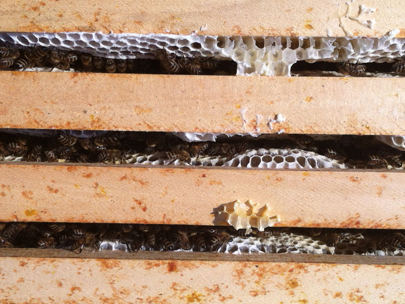 A l’occasion d’une randonnée à proximité, je suis allé voir ce qui se passait à l’intérieur d’une des 3 ruches (la mienne). Les abeilles ont construit les cadres des 2 hausses et ont commencé à les remplir de miel (1/4 environ).