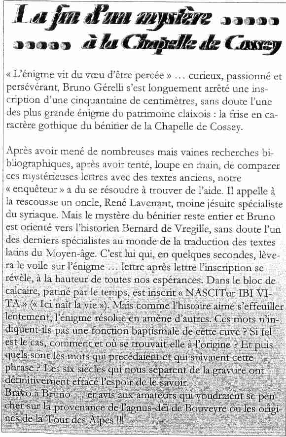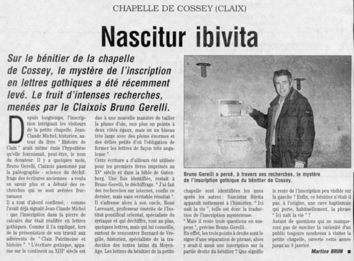 De la généalogie à la paléographie, il n’y qu’un pas... qui m’a conduit à m’intéresser à la traduction de l’inscription en latin gothique du bénitier de la chapelle de Cossey à Claix.