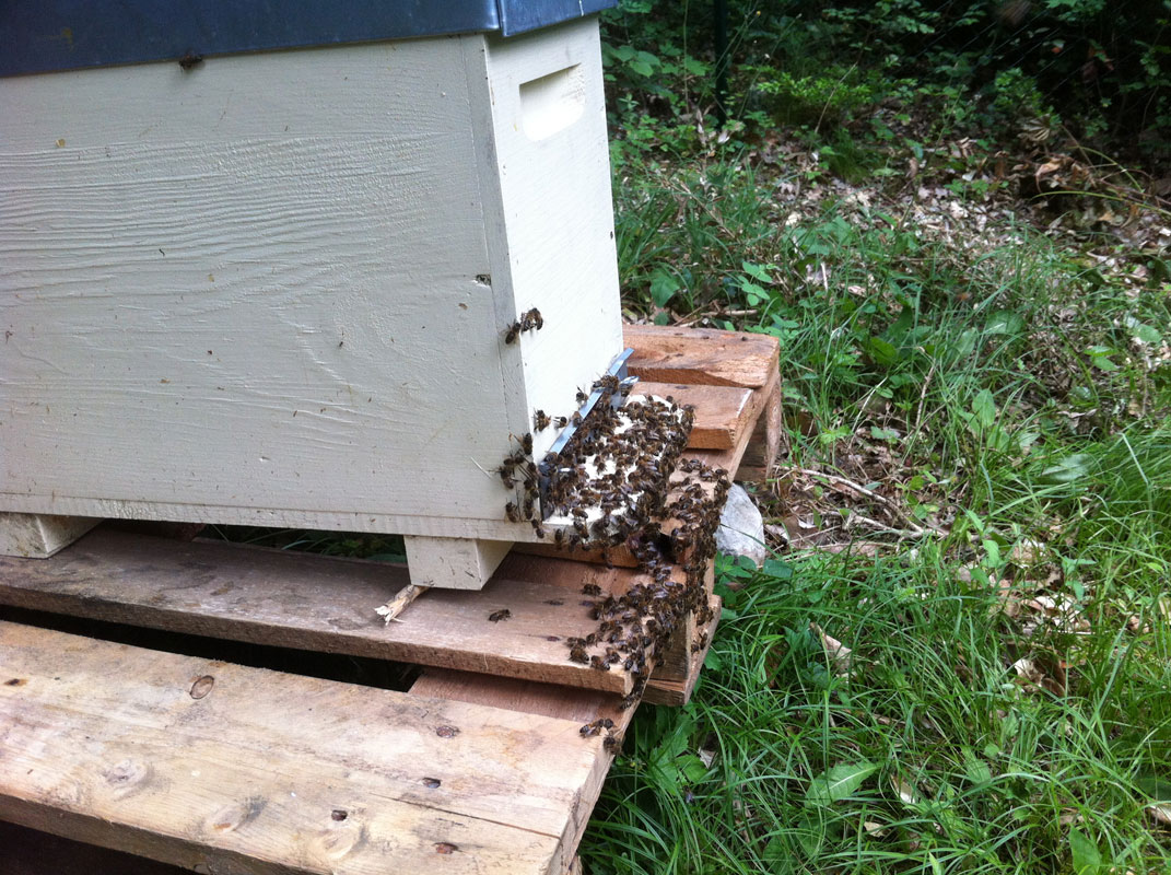 9- poser la ruchette à terre : vous voyez tout de suite si la reine est à l’intérieur, les abeilles à terre se dirigent rapidement vers leur génitrice !