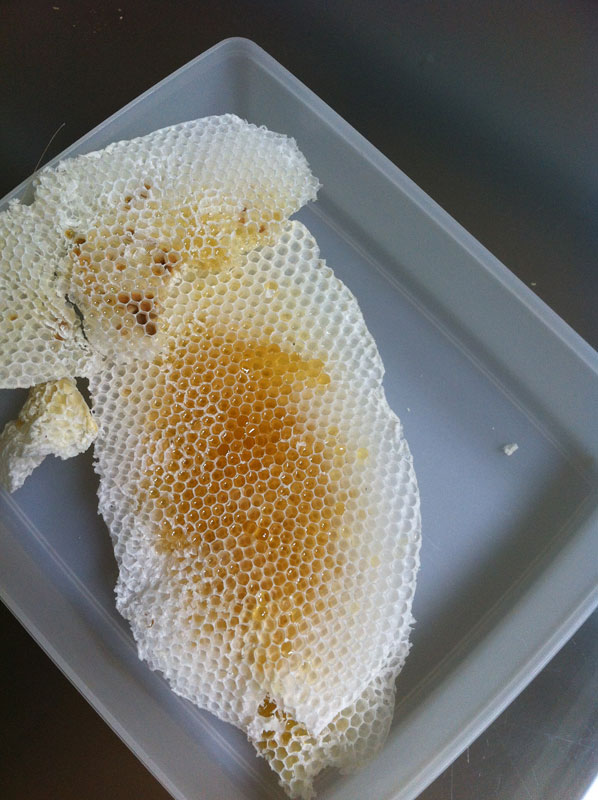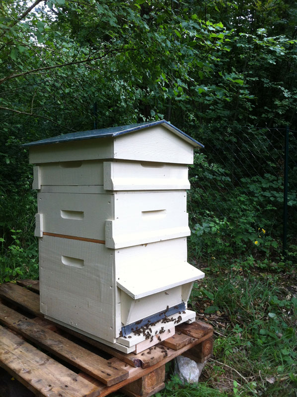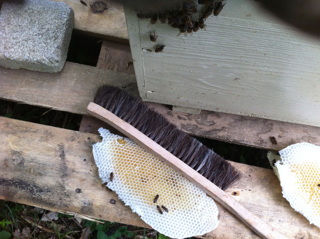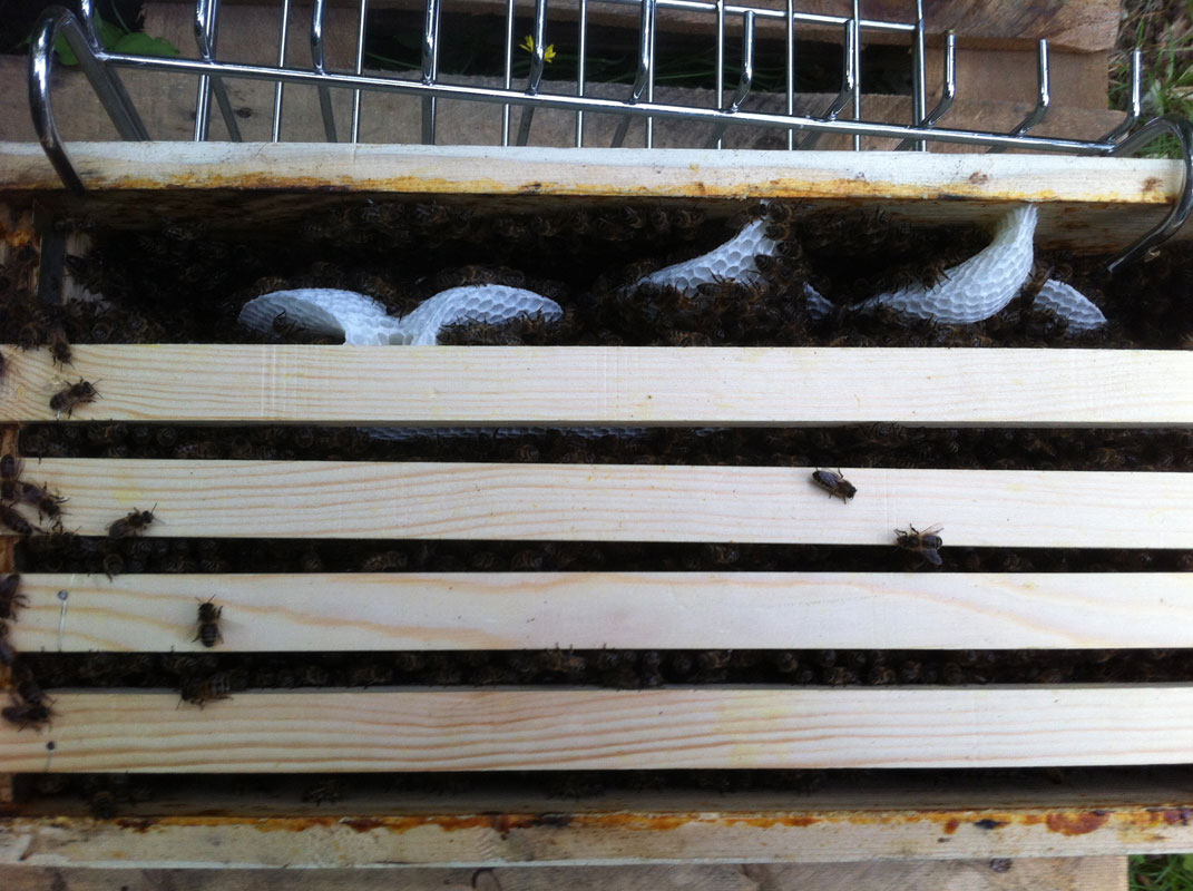 4 jours après, l’essaim semblait à l’étroit dans la ruchette, je l’ai transféré dans une ruche avec une hausse pour la récolte du miel parce que ces nouvelles abeilles semblent très productives. Au passage j’ai récupéré quelques pains de miel qu’elles avaient confectionné dans un espace vide de la ruchette. A mâcher délicatement pour savourer tout le miel contenu à l’intérieur !