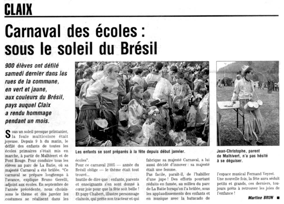 Je ne pensais pas que le mandant d’adjoint au Maire chargé des affaires scolaires m’amenerait à organiser le carnaval de Claix. Eh bien si ! Et en plus j’y ai pris beaucoup de plaisir. Après le Voyage dans le temps en 2003, l’Afrique en 2004, c’est au tour du Brésil en 2005.