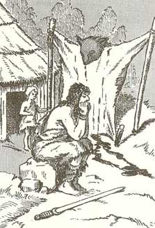Et, les yeux fixes, accroupi sur une pierre, les genoux ramenés presque jusqu’au menton, la tête entre les poings, l’homme, en silence, songeait, pendant que le souffle de l’air, montant par saccades de la vallée, secouait sa longue chevelure, balançait sur ses pieux la peau velue de l’ours, et repliait par instant la toison brune sur l’envers fraîchement écharné.