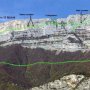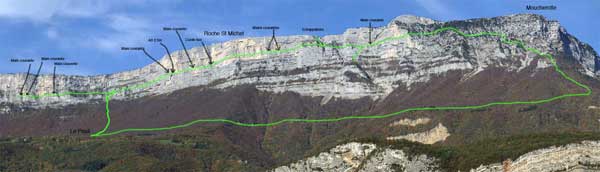 Cette vire est à faire dans le sens nord sud, pour éviter de coincer des chamois au niveau du passage de A0, très nombreux au sud au niveau de la grotte de la poterie ! L’itinéraire d’accès à la vire empreinte la montée du Moucherotte par la face Est, qu’il faut quitter au niveau d’un gros rocher assez caractéristique (dalle) en direction du sud, suivre les cairns et traces de chamois. Le passage de A0 comprends 4 points ou il est nécessaire de passer en artif. A cet endroit, la vire n’existe plus ! Il faut donc progresser en posant des pédales (ou sangles) sur chaque points d’artif."