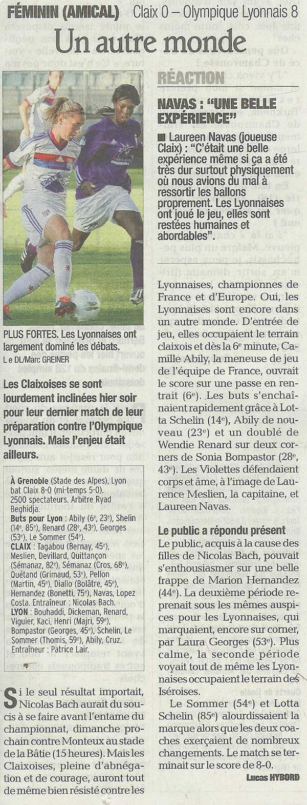 Cela a sans doute permis aux Claixoises de s’aguerrir face à une équipe au potentiel bien supérieur et aux spectateurs de voir évoluer une partie des meilleures footbaleuses du moment. Effectivement c’est également une excellente promotion pour le football féminin bien que l’équilibre des forces fut absent dans cette rencontre.