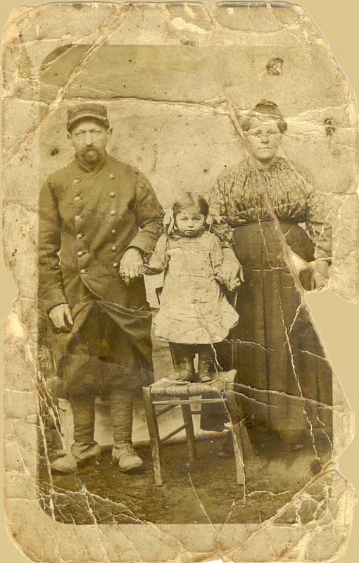Cette photo, conservée précieusement malgré son état, c’est celle de l’arrière grand-père d’Isabelle, une Claixoise, prise en 1916 lors d’une permission. Il pose avec sa femme et sa fille de 2 ans.