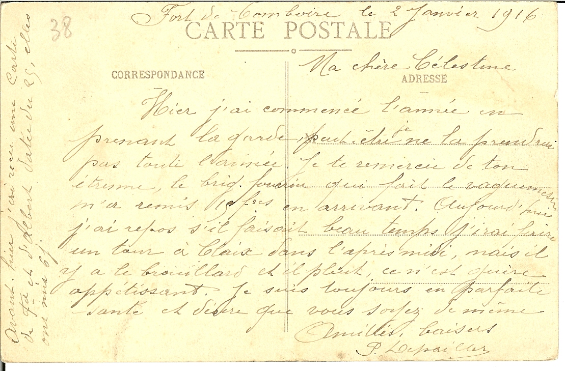Hier j’ai commencé l’année en prenant la garde. Peut être je ne la prendrai pas toute l’année. Je te remercie de ton étrenne, le brigadier fourrier qui fait le vaguemestre m’a remis 15 francs en arrivant. Aujourd’hui j’ai repos s’il faisait beau j’irai faire un tour à Claix dans l’après midi, mais il y a le brouillard et il pleut, ce n’est guère appétissant. Je suis toujours en parfaite santé et désire que vous soyez de même.
