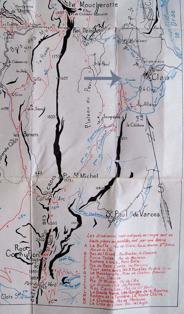 On voit également, que depuis Claix, l’itinéraire en rouge nous emmène au Pic St Michel par le Col de l’Arc, au Col Vert... et à tous les itinéraires que nous connaissons aujourd’hui.