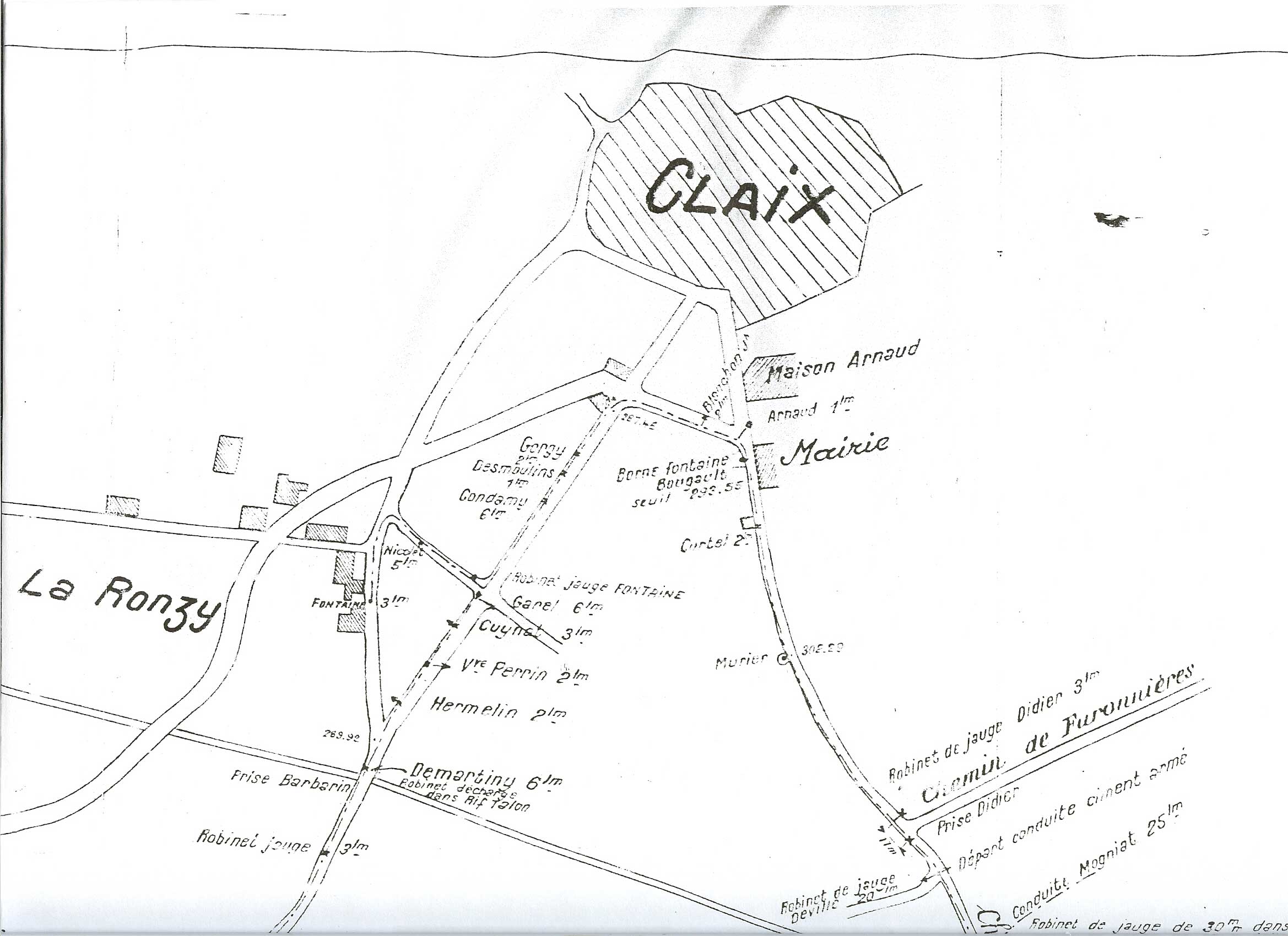 A Claix il y a une particularité peu connue des habitants : les réseaux d’eau privés. Il en existe 4 principaux : Bougault, Fantin (appelé aussi Royer ou Ronzy), Cossey et Burdet. On en trouve également à Furonnières ainsi que dans de nombreuses propriétés qui sont alimentées par des sources privées.