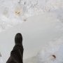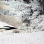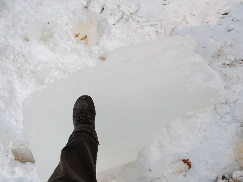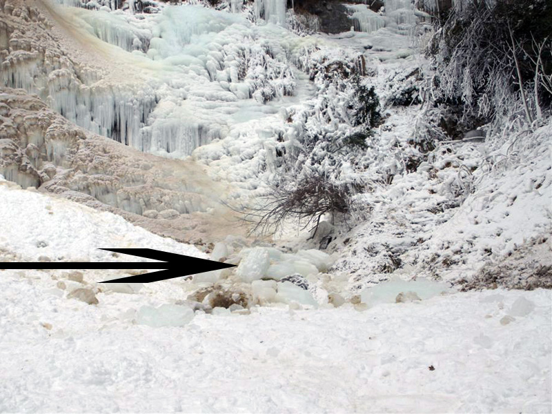 Sur la première on voit une sympathique mère de famille avec son chien en train de prendre son enfant en photo au pied de la cascade. Sur la seconde, prise 4 jours plus tard, on voit, à l’emplacement exact ou se trouvait cette charmante famille, quelques blocs de glace qui se sont détachés de la paroi (flèche noire). Et pour que vous compreniez qu’il ne s’agit pas de cubes de glace de la taille de ceux que l’on met dans le pastis, je suis allé (très rapidement) en photographier un morceau avec mon pied dessus pour mieux visualiser la taille (je chausse du 44 !).