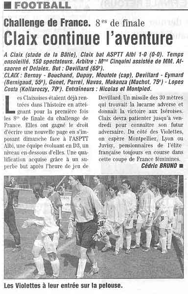 Fin de l’histoire : dimanche 30 avril Claix foot féminin s’inline par 4 à 0 face à l’Olympique Lyonnais. Une belle aventure tout de même !