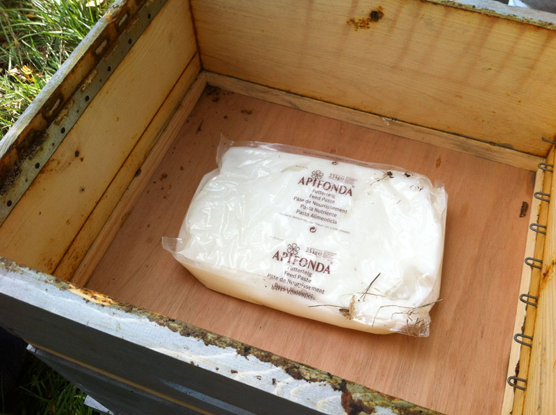En premier lieu, à l’issue de la récolte du miel, il faut nourrir les abeilles pour qu’elles puissent reconstituer leurs provisions pour l’hiver. On utilise pour cela du Butiforce qui est un sirop de nourissement à base d’eau, de glucose, de fructose, de maltose et de sucres. Au final il faut qu’une ruche ait emmagasiné environ 15 kg de miel pour passer l’hiver. Sinon, pour les colonies faibles on peut leur donner du sucre Candi (APIFONDA) pour compléter.