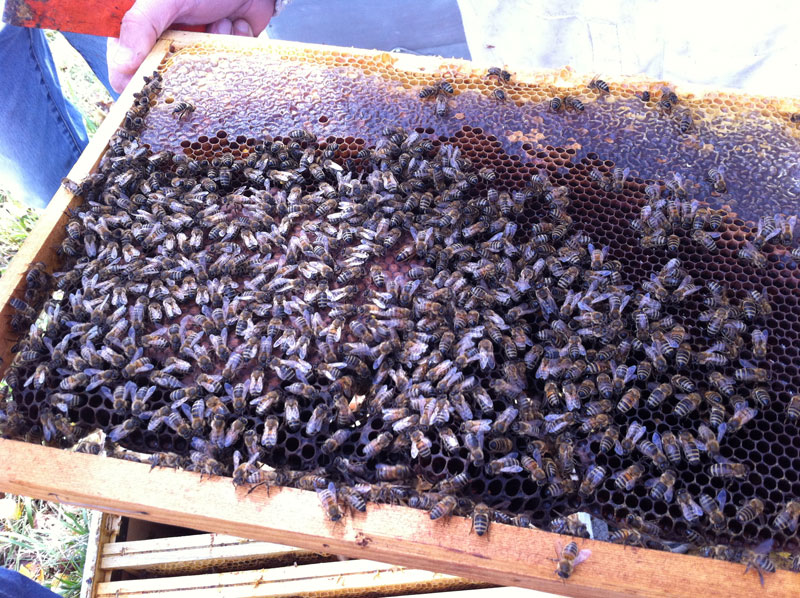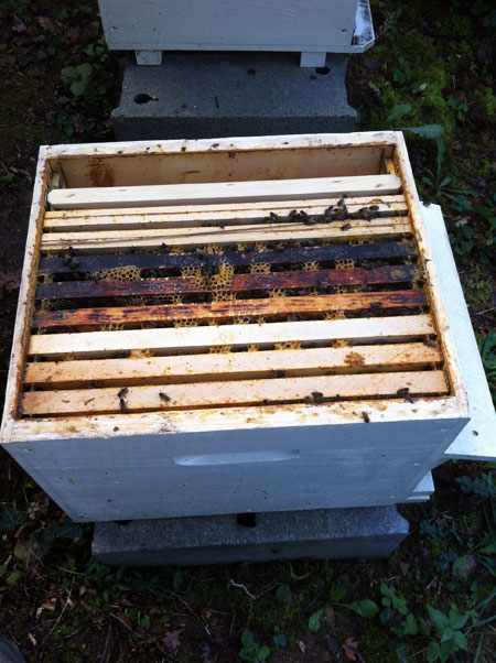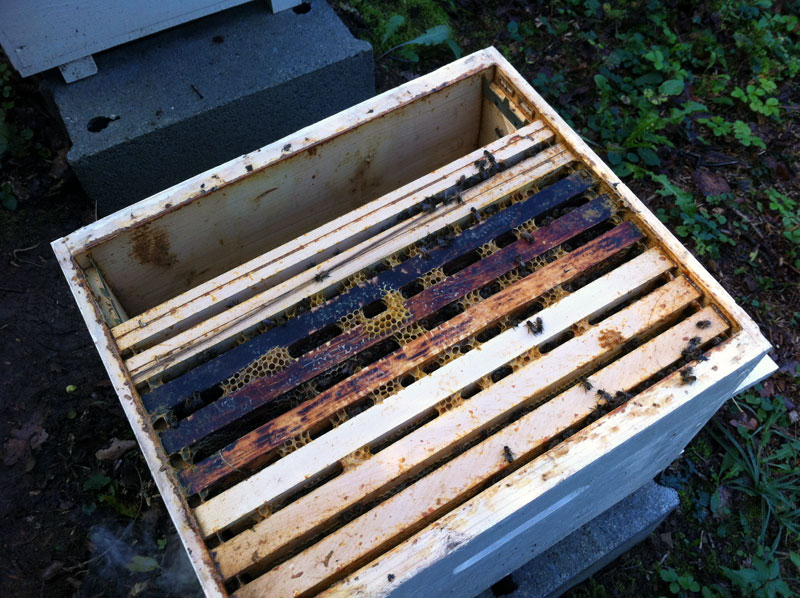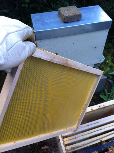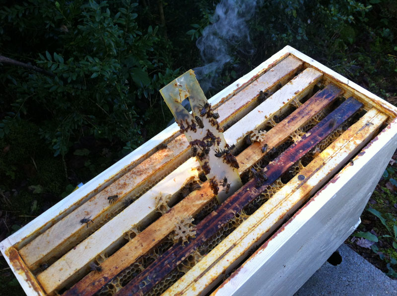 Ensuite on vérifie l’état de l’essaim et on enlève le traitement anti varroa, les cadres vides pour regrouper les abeilles. On isole du reste de la ruche avec une séparation.