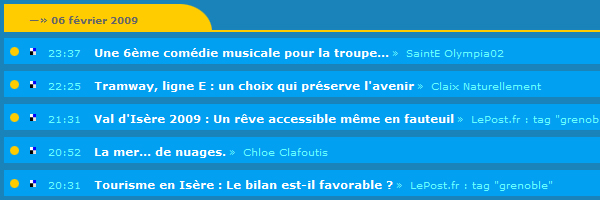 Tous les jours vous pouvez suivre les publications des 140 blogs répertoriés dans cet agrégateur. Mieux que le Dauphiné Libéré… et en plus c’est gratuit !