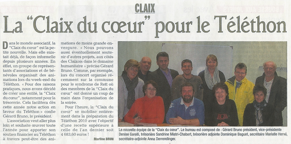 Année après année, rien ne ressemble plus au Téléthon que le Téléthon. Pourtant à Claix, cette édition 2010 est différente des précédentes de par son organisation. Une nouvelle association « La Claix du cœur » vient de voir le jour, composée des fidèles bénévoles qui accompagnent le Téléthon à Claix depuis sa création. C’est cette association qui maintenant prend en main les destinées du Téléthon Claixois.