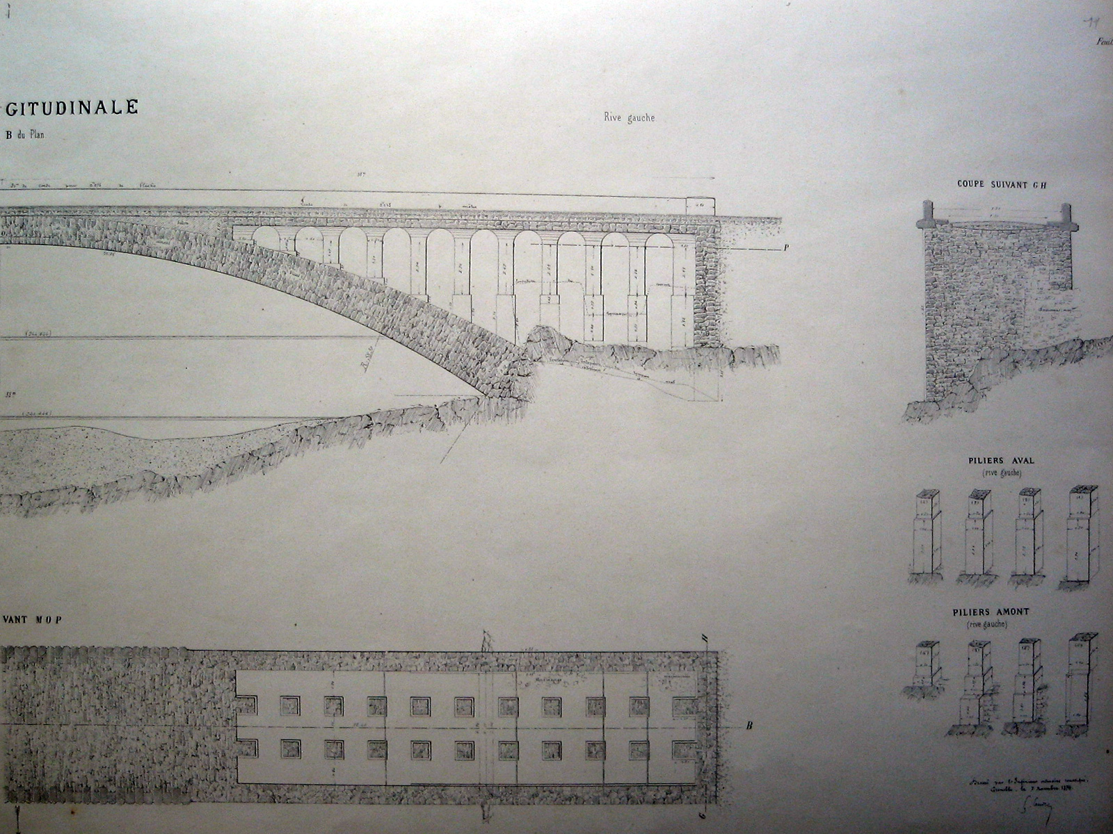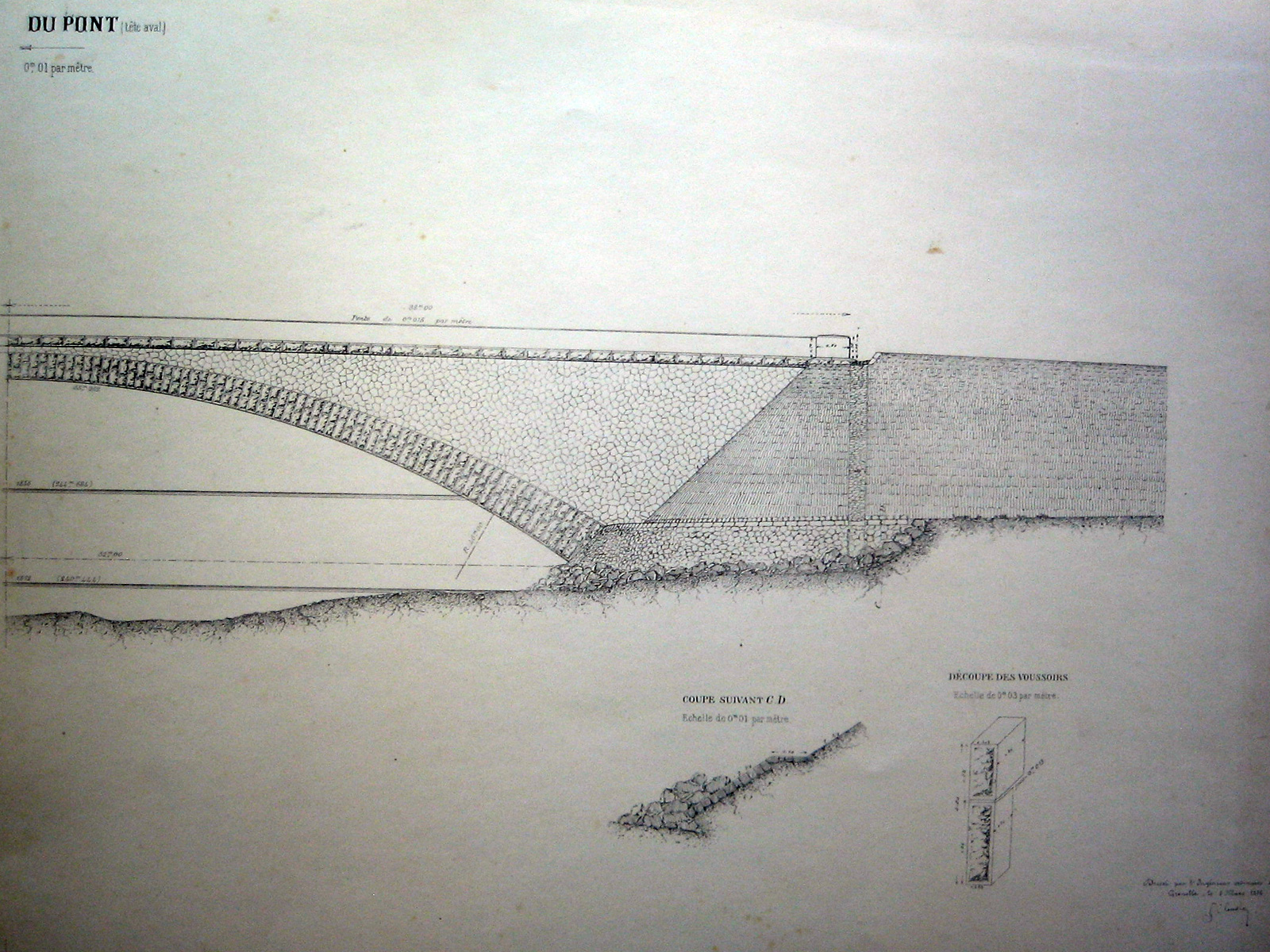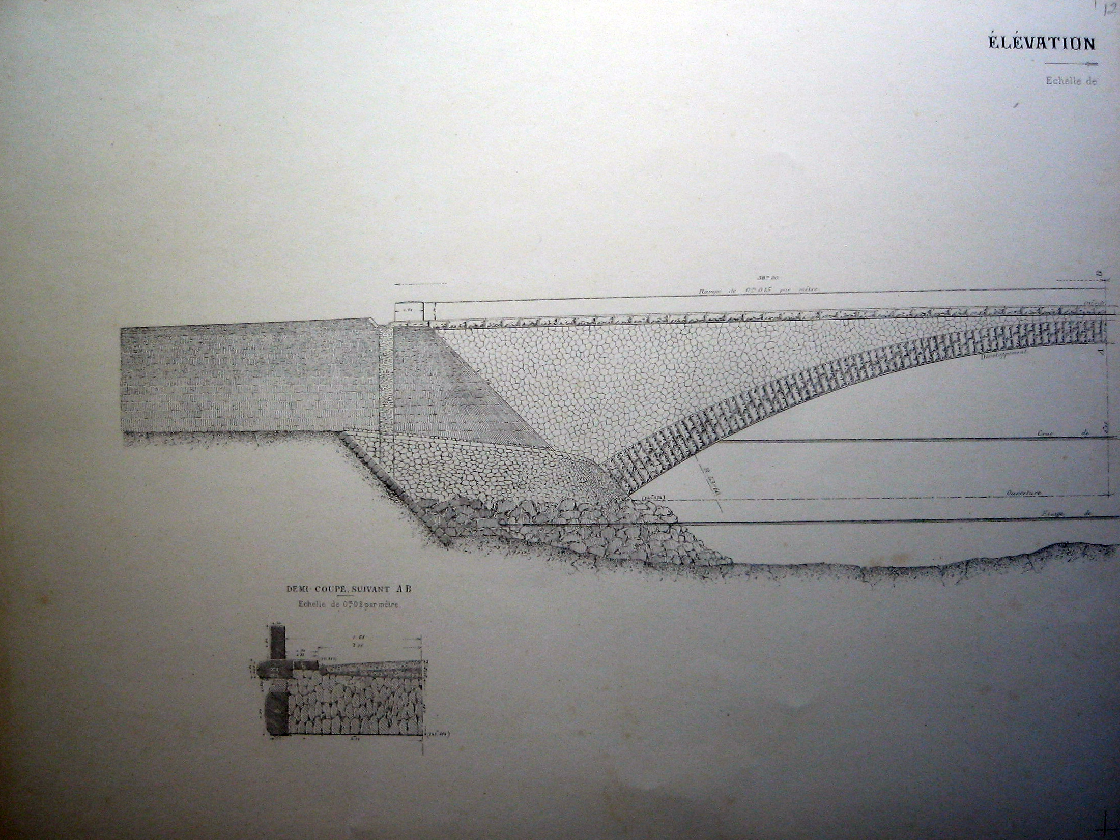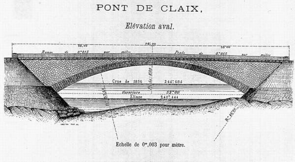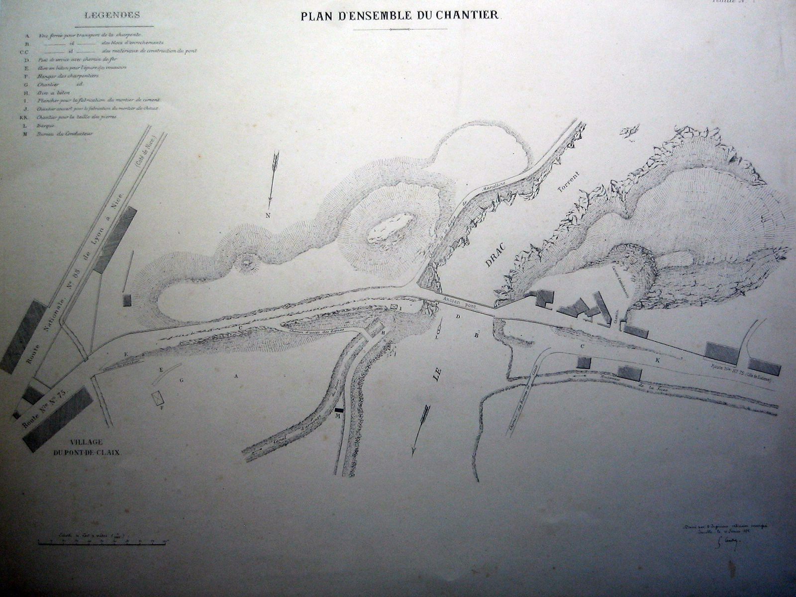 Extrait : "Le pont de Claix (Isère), sur le Drac, a été construit en 1873 par la société Vicat et avec ses ciments. Le projet a été dressé sous la responsabilité de M. Berthier, ingénieur en chef des ponts et chaussées et dirigé par M. Gentil, ingénieur ordinaire des ponts et chaussées Il est composé d’une voûte unique de 52 m d’ouverture, de 8,05 m de flèche et de 1,05 m d’épaisseur à la clef. Les bandeaux de ce pont sont seuls en pierre de taille ; l’intrados est en moellons à assises réglées, et le corps de la voûte, en maçonnerie brute".