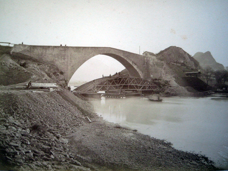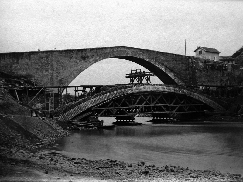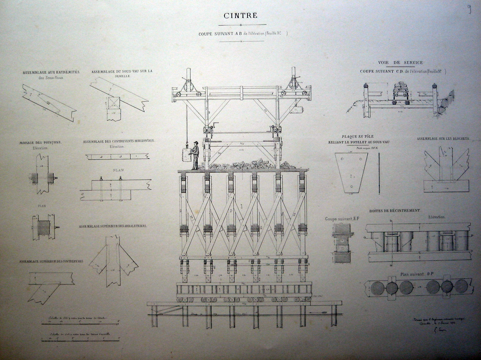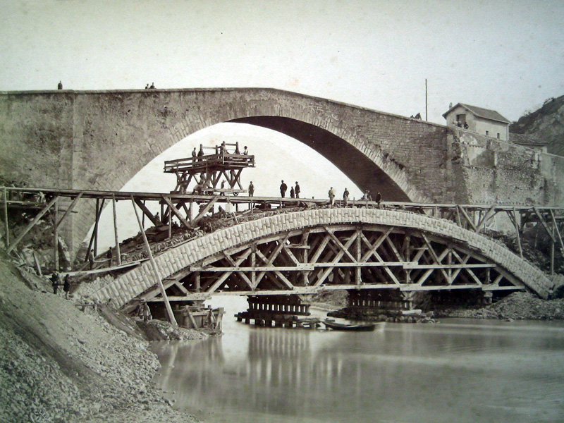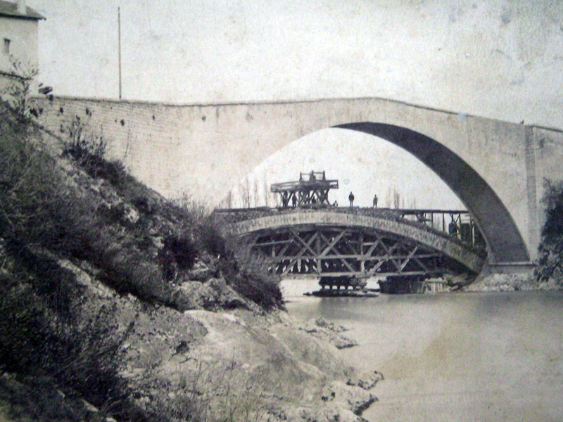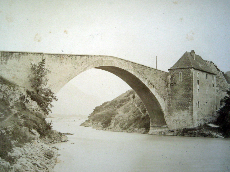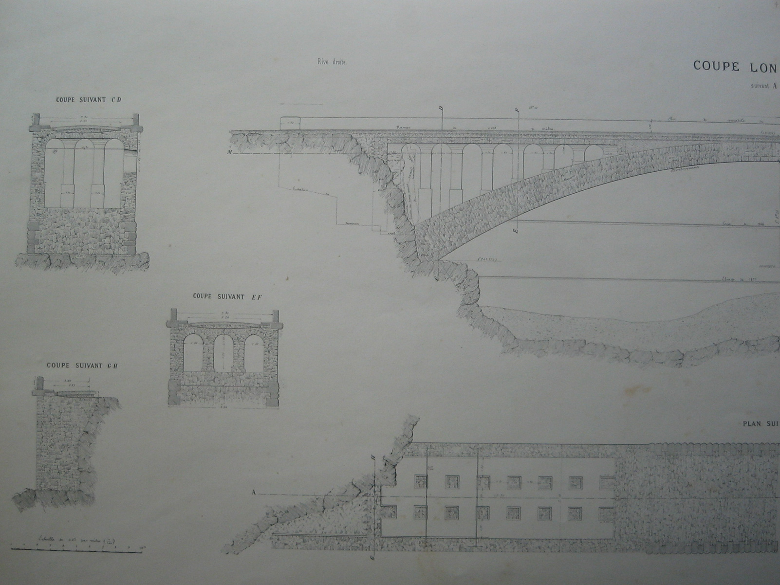 Extrait : "Le pont de Claix (Isère), sur le Drac, a été construit en 1873 par la société Vicat et avec ses ciments. Le projet a été dressé sous la responsabilité de M. Berthier, ingénieur en chef des ponts et chaussées et dirigé par M. Gentil, ingénieur ordinaire des ponts et chaussées Il est composé d’une voûte unique de 52 m d’ouverture, de 8,05 m de flèche et de 1,05 m d’épaisseur à la clef. Les bandeaux de ce pont sont seuls en pierre de taille ; l’intrados est en moellons à assises réglées, et le corps de la voûte, en maçonnerie brute".
