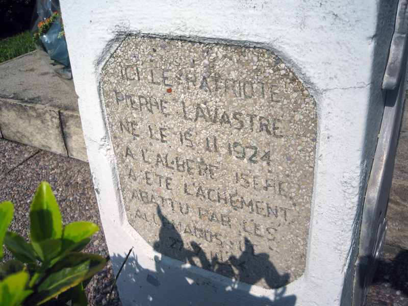Le troisième monument est situé rue du Drac, à proximité de la ZAC de Fond Ratel, à l’endroit exact où Pierre Lavastre a été tué le 27 juillet 1944. A noter que la plaque commémorative fait toujours référence aux « Allemands ».