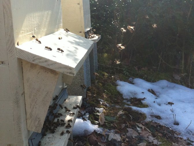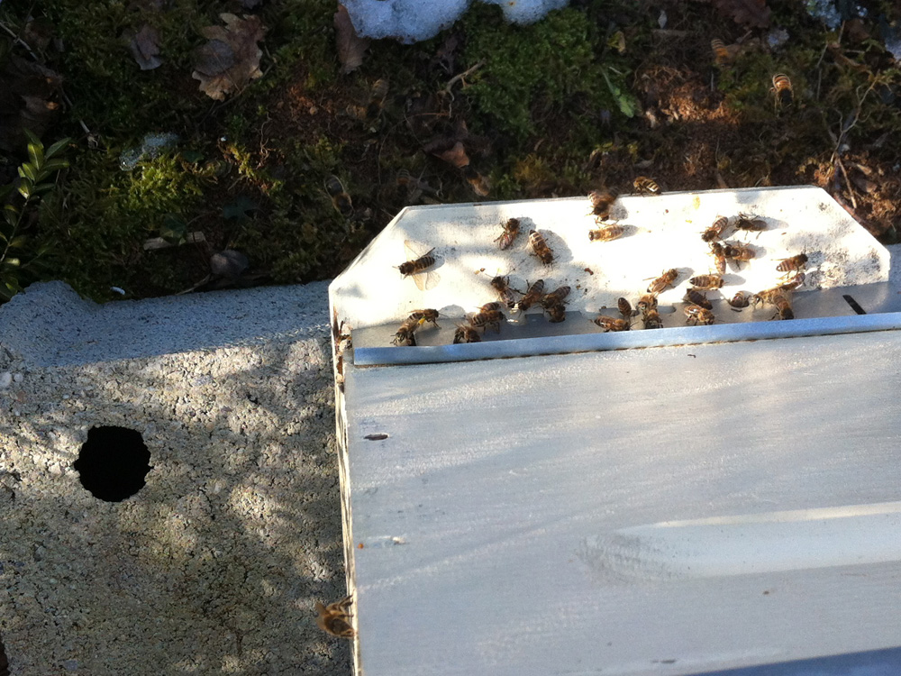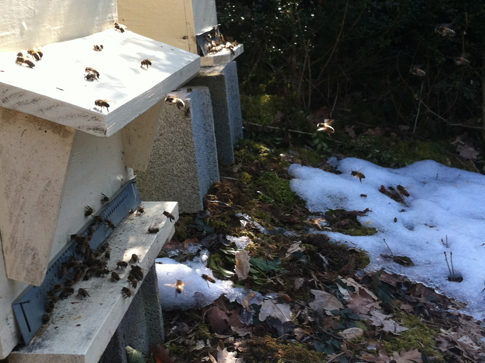 Même si les matinées sont encore glaciales et la neige encore présente, les abeilles font leur réapparition. L’hivernage se termine.