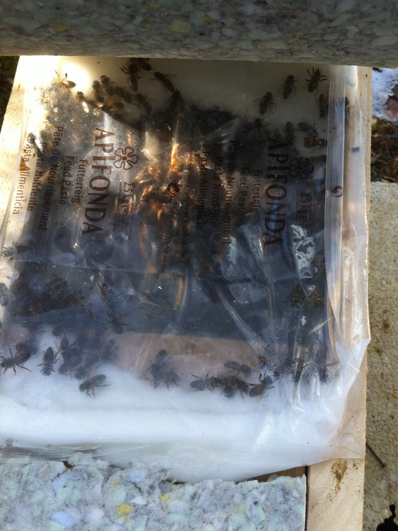 J’ai simplement vérifié qu’elles ont encore assez de nourriture. La pâte de nourrissement (APIFONDA) que je leur ai mis fin décembre n’est pas encore entièrement consommée. A surveiller régulièrement pour que l’essaim puisse se développer correctement.