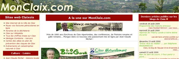 MonClaix.com (prononcer "Mon Claix point comme") est un portail internet qui permet de découvrir rapidement l’ensemble des sites internet se rapportant à Claix et de suivre facilement l’actualité des blogs Claixois.