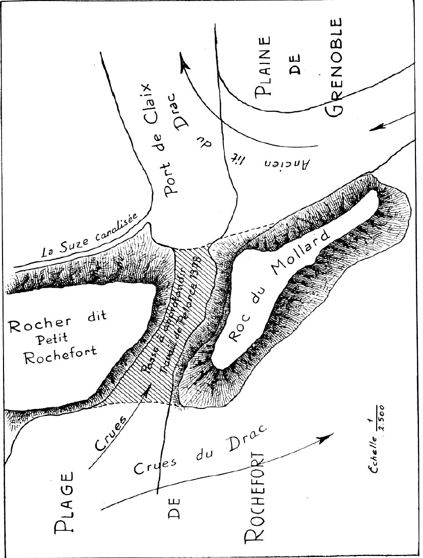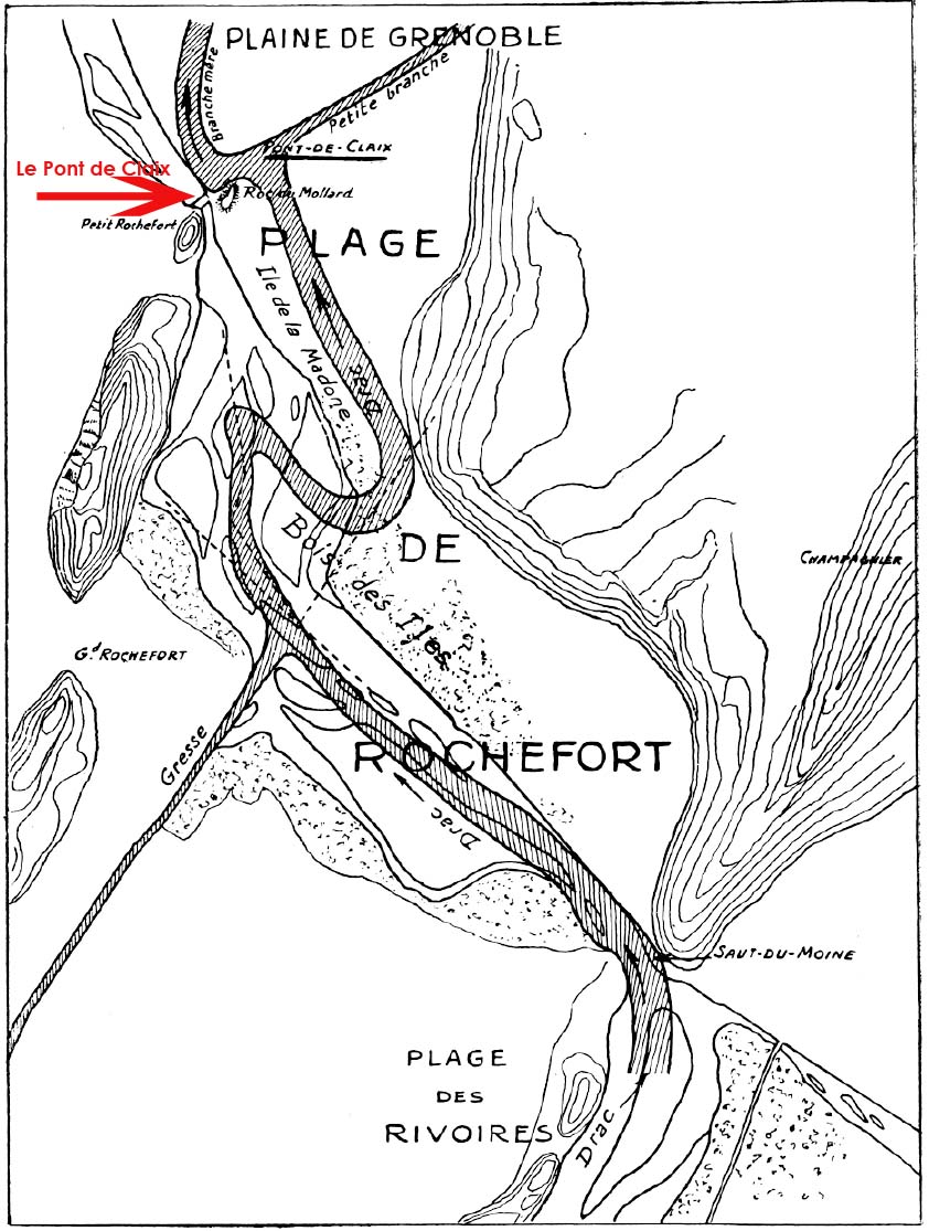 C’est l’objet des premiers travaux effectués en 1377 par l’entrepreneur Pellorce pour faire passer le Drac entre le Petit Rochefort (montée du pont de Claix actuelle) et le Mollard (où se situe aujourd’hui le château d’eau de Pont de Claix) - 2ème plan.