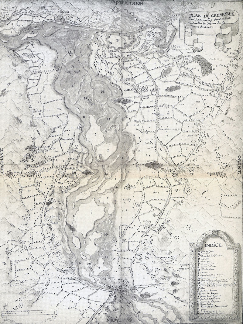 Et pour finir, vous pouvez admirer le plan de Grenoble (1680) qui montre le lit du Drac tel que les Grenoblois l’on connu de 1377 jusqu’à la fin du XVIIème siècle, lorsque fut construit le cours St André… mais ceci est une autre histoire !
