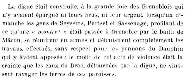 La digue fut détruite que ce soit par les « gens de Seyssins » ou par le Drac lui même et reconstruite plusieurs fois.