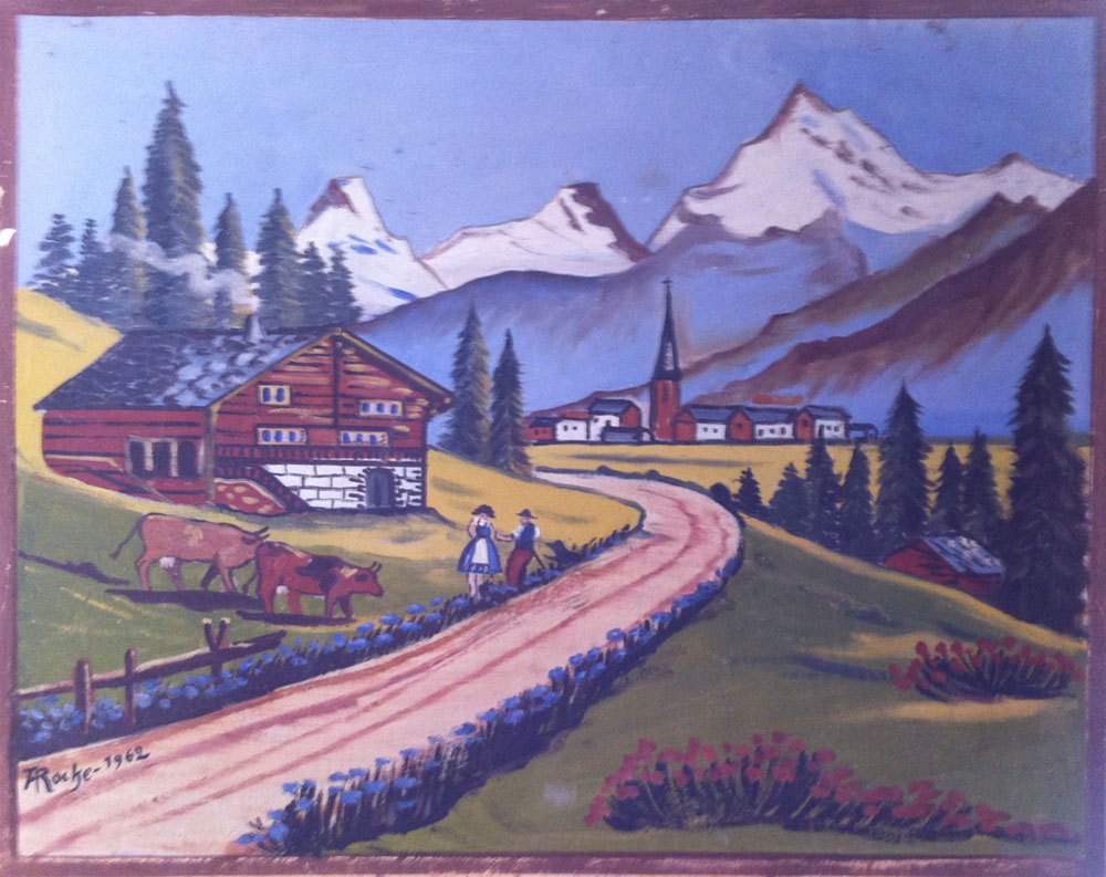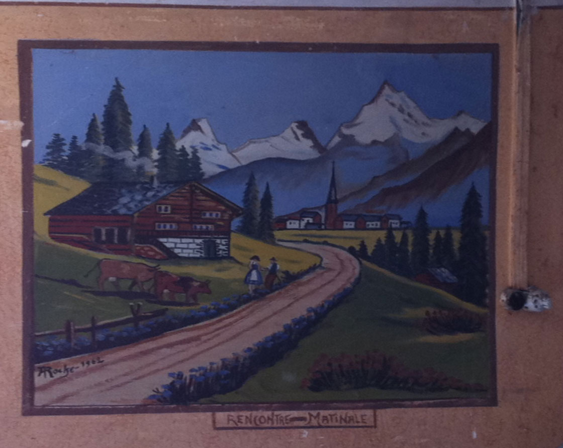 Aux dire de mes interlocuteurs, à cette époque, un peintre surnommé « Torchebugne », qui signait F.( ?) Roche, exerçait ses talents dans la région grenobloise. Ce n’était pas un artiste peintre mais un peintre en bâtiment originaire de Fontaine qui illustrait chaque fois ses travaux d’un tableau ou d’une petite fresque.