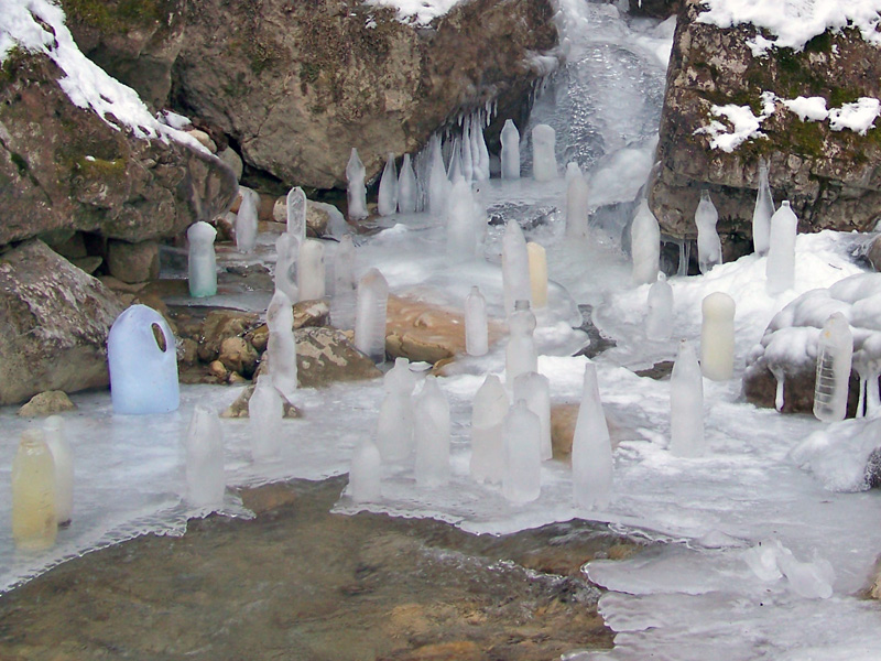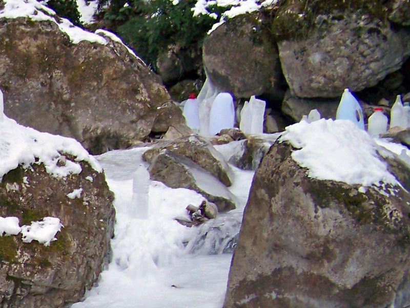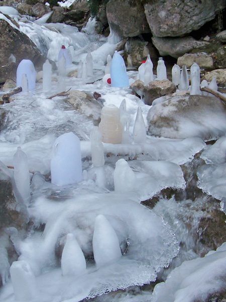 En bonus vous trouverez mes photos de l’œuvre éphémère de Hugo Exbrayat faite à partir d’eau gelée dans des bouteilles plastiques. Contrairement à ce que j’avais écrit dans le premier article, les enveloppes plastiques ont été enlevées et ne finiront pas dans la Pissarde.