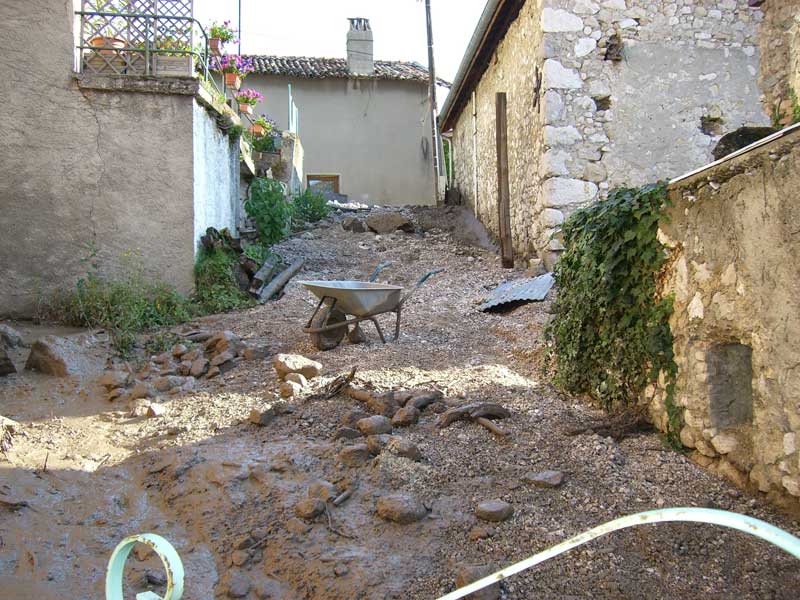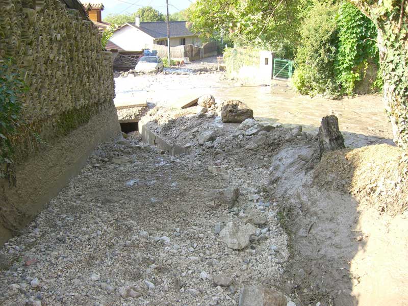 Les barrages en béton qui ont étè contruits en amont du Sabot aprés la crue de 1955 se sont comblés aussi progressivement, et ne remplissent plus leur rôle de retenue de matériaux, de plus ceux-ci n’ont pas étè curés lors du précèdent débordement à Malhivert en 1996, ce qui l’aurait réduit cette fois-ci.