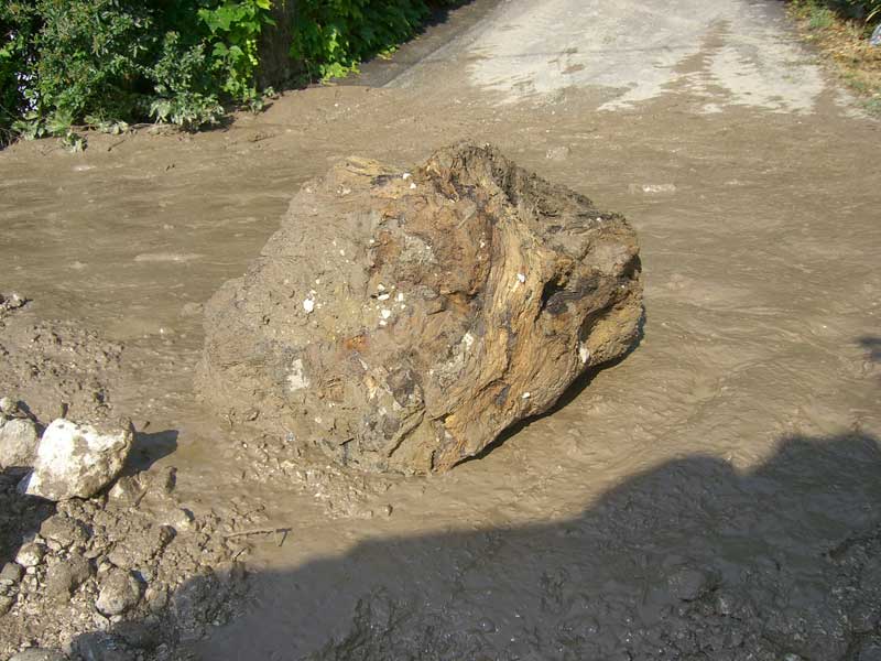 Peut être un glissement de terrain en amont et/ou la rupture brusque d’une poche d’eau qui ont entraîné tous ces matériaux. On ne sait pas encore.
