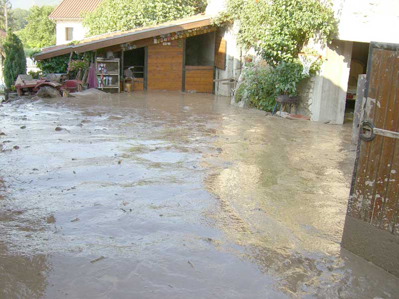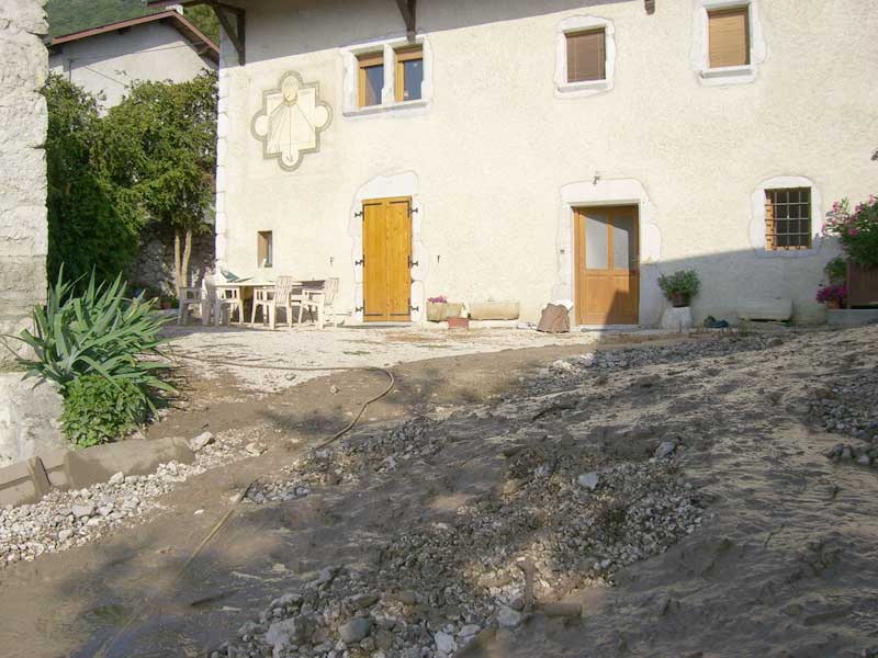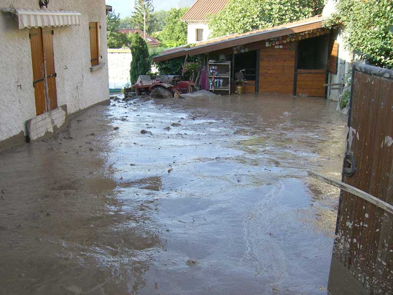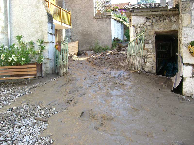 Juste à l’entrée du hameau, le Rif talon est sorti de son lit, envahissant la route, les cours en contrebas et une maison.